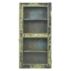 Vitrine murale en bois patiné à fond turquoise (121 x 44 x 21cm)