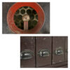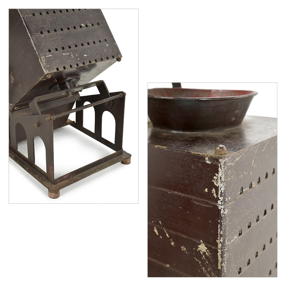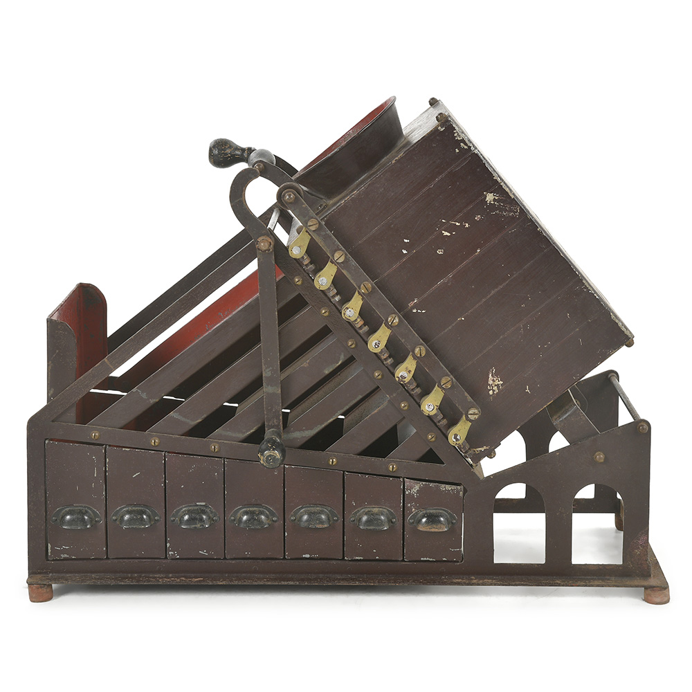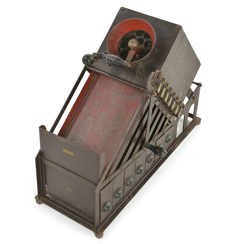Entièrement réalisé en métal peint et patiné, ce trieur repose sur une structure robuste intégrant un système incliné de glissières et de compartiments destinés au tri mécanique des pièces.