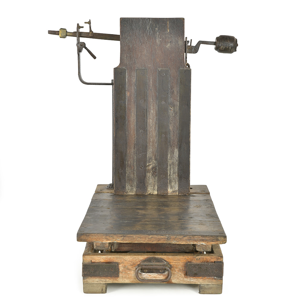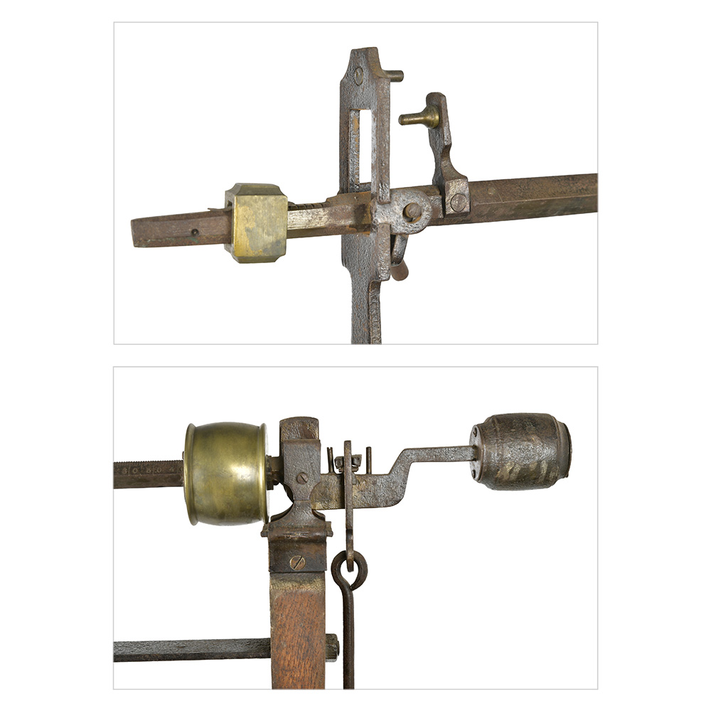 Dotée de son mécanisme d’origine avec bras de levier, contrepoids et plateau, cette balance impressionne par sa présence et la qualité de sa fabrication artisanale.