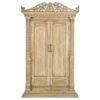 Conception : Deux battants encadrés par une structure complète avec base et fronton sculpté. Colonnes torsadées de chaque côté, chapiteaux et corniche haute décorée d’une frise ajourée à motifs végétaux. Poignées en métal anciennes conservées.