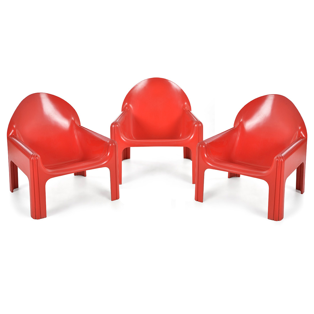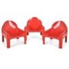 Ensemble de 3 fauteuils rouges en plastique – Design Gae Aulenti pour Kartell (77 x 72 x 67cm)