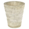 - Matériau et finition : Ciment brut, vieilli naturellement. Stries horizontales formant un motif discret et rythmique sur tout le pourtour.