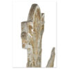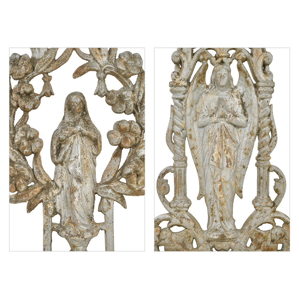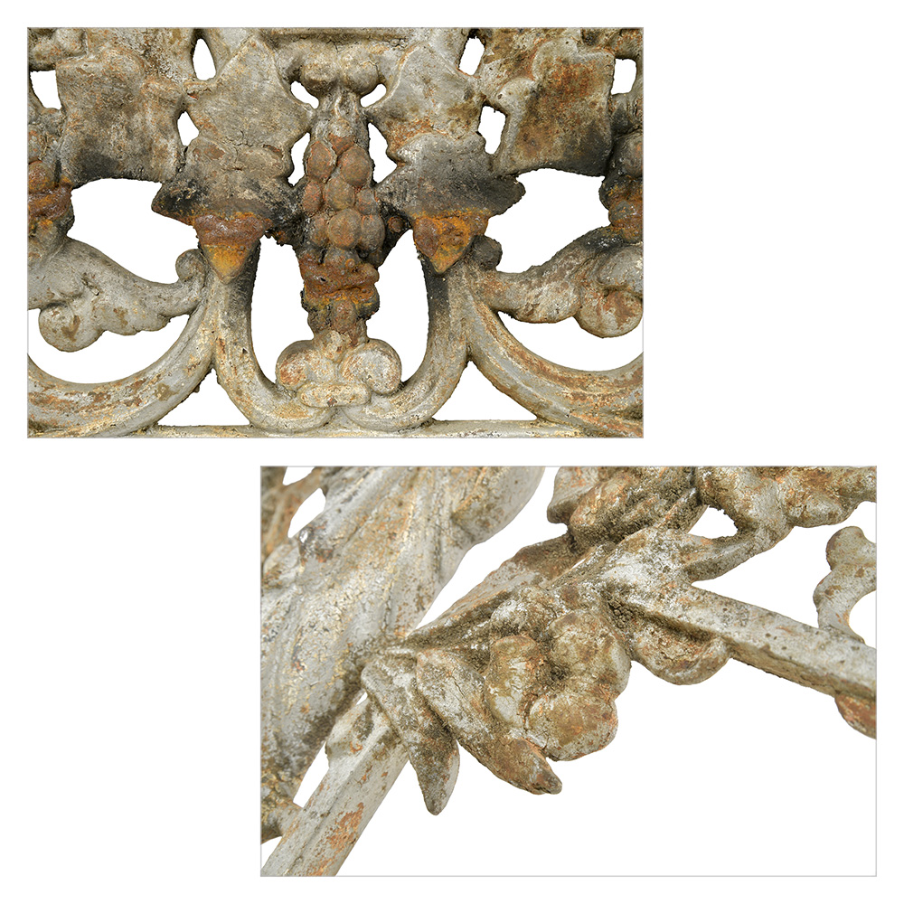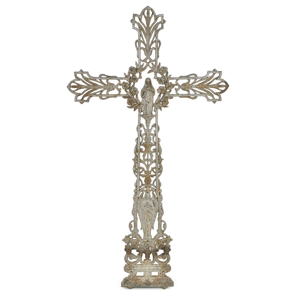 Imposante et profondément expressive, cette grande croix ancienne en fonte patinée incarne toute la solennité et la richesse décorative de l’art religieux de la fin du XIXᵉ et du début du XXᵉ siècle. Par son dessin ajouré, ses motifs végétaux et ses figures sculptées, elle témoigne d’un savoir-faire remarquable et d’une forte charge symbolique. Caractéristiques principales : Matériaux et conception : Entièrement réalisée en fonte moulée, cette croix se distingue par un travail ajouré d’une grande finesse. Les bras et le fût sont ornés de motifs végétaux stylisés, tandis que le centre accueille une figure religieuse en relief, entourée d’une couronne florale. La patine claire, nuancée de gris, d’ocre et de traces d’oxydation naturelle, révèle une corrosion maîtrisée qui confère à l’ensemble une profondeur et une authenticité saisissantes. La base, richement décorée, assure stabilité et verticalité à cette pièce monumentale. Dimensions : Hauteur : 152 cm - Largeur : 85 cm - Profondeur : 5 cm Matériau : Fonte patinée Époque : Fin XIXᵉ – début XXᵉ siècle Détails et usage : Probablement destinée à un usage funéraire ou cultuel, cette croix pouvait autrefois orner une sépulture, un enclos religieux ou un lieu de dévotion. Aujourd’hui, elle trouve une nouvelle lecture décorative forte : - Placée dans un jardin, elle devient une sculpture verticale au caractère intemporel. - Installée dans un intérieur de style maison de campagne, atelier ou lieu patrimonial, elle s’impose comme une œuvre sculpturale à part entière. - Elle peut également être détournée comme élément scénographique dans un espace d’exposition ou un lieu chargé d’histoire. Une présence spirituelle et sculpturale Cette croix en fonte ne se contente pas d’être un objet religieux : elle est une véritable pièce d’ornement, où la symbolique sacrée rencontre la beauté brute du matériau et l’empreinte du temps. Une œuvre puissante, chargée d’émotion et de mémoire, idéale pour les amateurs d’objets anciens au caractère affirmé et à l’esthétique profondément authentique. Retrait en magasin gratuit. Pour toutes livraisons, contactez-nous par téléphone ou mail pour un devis personnalisé.