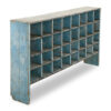 Ce meuble d’atelier en bois massif séduit par la force de son caractère et la singularité de son design utilitaire. Composé de 32 cases à fond en zinc, il conserve une patine bleu passé qui témoigne de décennies d’usage, évoquant les ateliers et manufactures d’antan. Caractéristiques principales : - Matériau et finition : Bois massif avec fond en zinc, patine bleu-vert usée et marques du temps apportant un charme brut et industriel. - Conception : Structure rectangulaire à 32 compartiments, chiffres et inscriptions peints d’origine en bordure des cases. - Dimensions : Hauteur 68 cm – Largeur 125 cm – Profondeur 20 cm. Un meuble fonctionnel et décoratif Parfait pour : - Structurer un espace de travail ou une boutique au style vintage ou industriel. - Ranger des outils, accessoires ou objets de collection. - Être détourné en meuble d’entrée, bibliothèque murale ou présentoir décoratif. Cette pièce unique illustre la robustesse et le pragmatisme du mobilier d’atelier du XXᵉ siècle, tout en offrant une esthétique intemporelle. Retrait en magasin gratuit. Pour toutes livraisons, contactez-nous par téléphone ou mail pour un devis personnalisé.