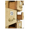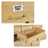 - Matériau et finition : Structure en bois massif à la teinte naturelle, usée par le temps, avec une belle patine d’atelier. Poignées en laiton doré d’origine, étiquettes émaillées numérotées.