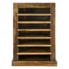 Réalisé en bois brut à la patine chaleureuse, ce meuble présente une finition naturelle qui laisse apparaître les veinures du bois et ses marques du temps. Les plateaux, légèrement chanfreinés, glissent dans des rainures latérales et peuvent être retirés individuellement. La structure repose sur une base légèrement saillante, accentuant sa stabilité et sa présence au sol.