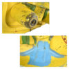 Cet ancien ensemble de pièces industrielles, originellement utilisé dans une usine indienne, s’impose par son graphisme audacieux et sa composition en volume. Monté sur une large plaque verticale, l’ensemble évoque à la fois un schéma technique et une sculpture contemporaine. Sa palette vive – dominée par un jaune solaire ponctué de verts profonds, de bleu clair et d’inscriptions rouges – lui confère un attrait décoratif saisissant.