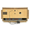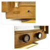 Réalisée en bois massif et placage verni, la radio présente une teinte miel chaleureuse, rehaussée de filets décoratifs et de courbes typiques du design des années 1940-50. Le tissu d’origine recouvrant le haut-parleur, le cadran de réglage imprimé et les trois molettes en façade témoignent d’une belle authenticité.