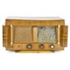 Réalisée en bois massif et placage verni, la radio présente une teinte miel chaleureuse, rehaussée de filets décoratifs et de courbes typiques du design des années 1940-50. Le tissu d’origine recouvrant le haut-parleur, le cadran de réglage imprimé et les trois molettes en façade témoignent d’une belle authenticité.