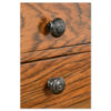 Réalisé en bois massif, ce secrétaire présente un joli contraste entre la teinte chaude du placage et le noir profond des pieds tournés. Le plateau est recouvert d’un cuir noir encadré d’un filet doré estampé, offrant une surface d’écriture élégante et durable. Les tiroirs supérieurs sont munis de petits boutons ronds en bois teinté noir.