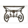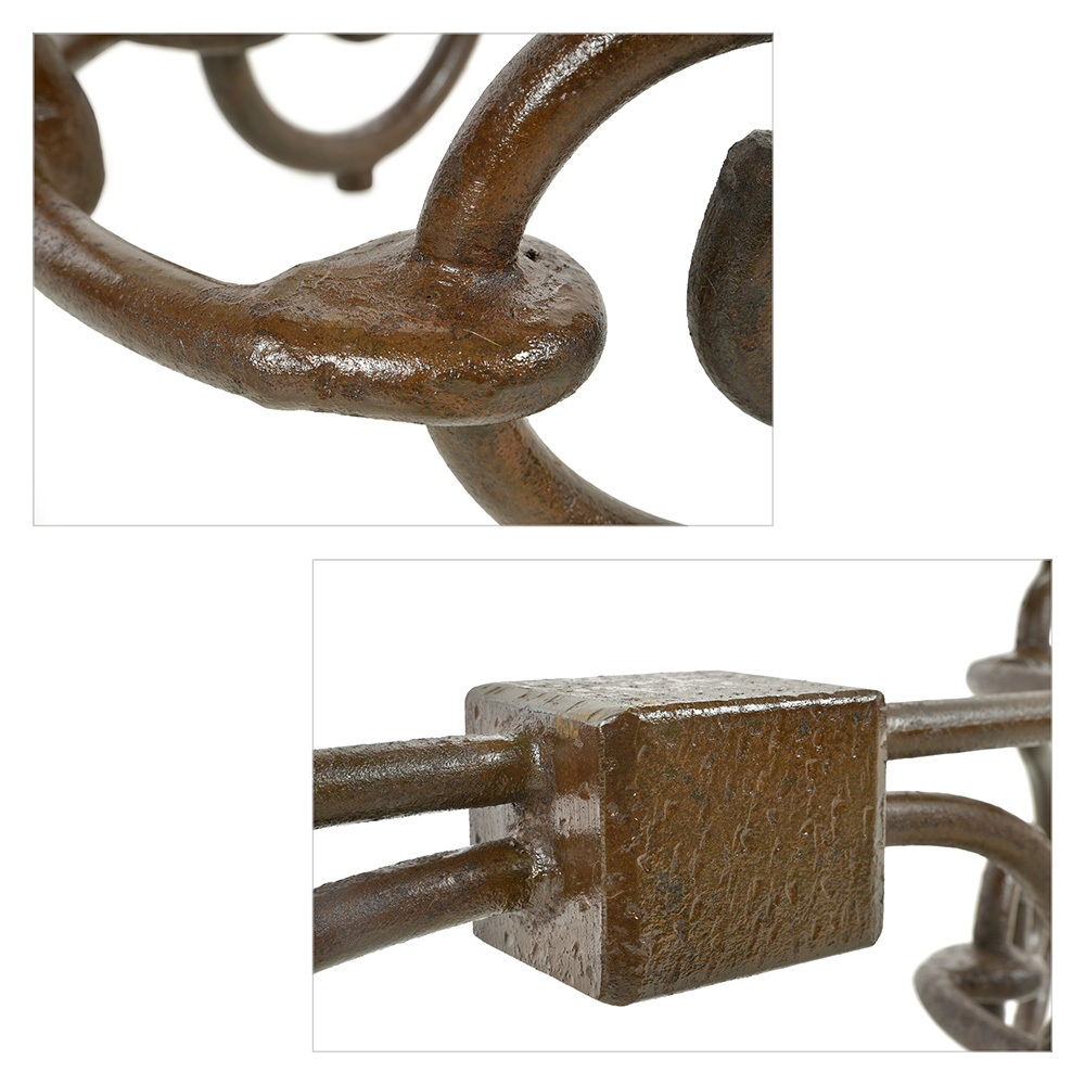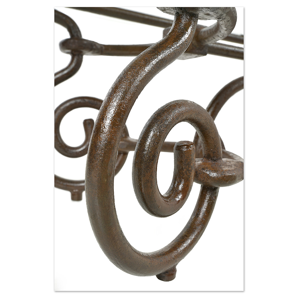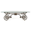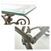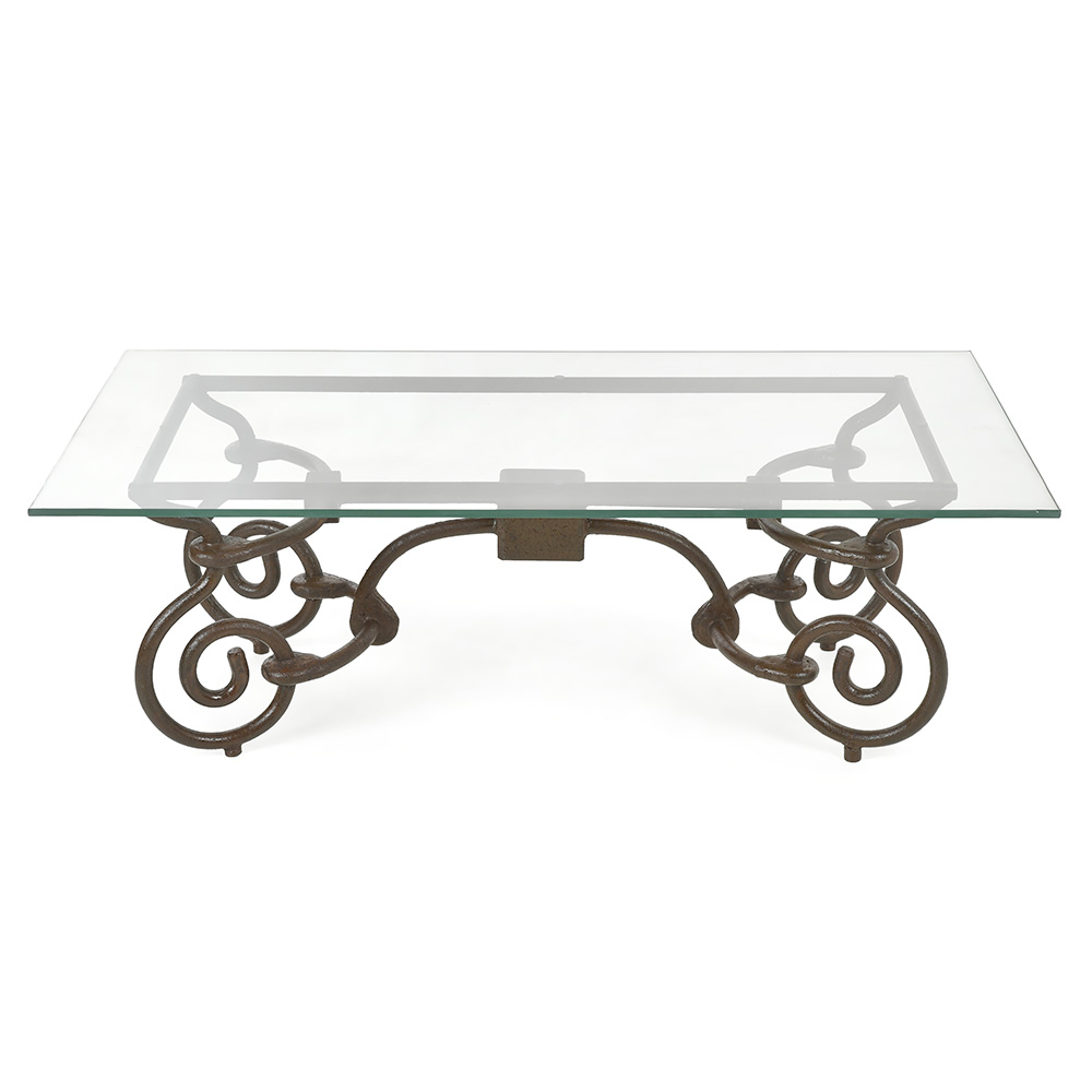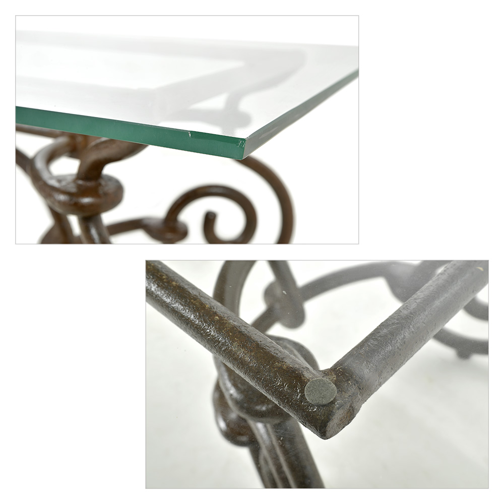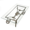 Structure en fonte au décor sinueux et symétrique, composée de courbes et volutes forgées à la main. Le plateau rectangulaire en verre épais repose directement sur la structure, révélant la beauté brute du métal travaillé.