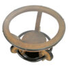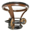 Conception : Piètement en bois travaillé formant des volutes circulaires, socles solides et élégants, plateau de la table basse en verre rond laissant apparaître le beau travail de la base.
