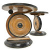 Cet ensemble harmonieux composé d’une table basse en bois et verre et de deux bouts de canapé en bois sculpté attire l’œil par son design circulaire et sa structure sculpturale. Le mariage du bois aux teintes chaudes et du verre crée un bel équilibre entre solidité et légèreté visuelle.