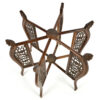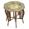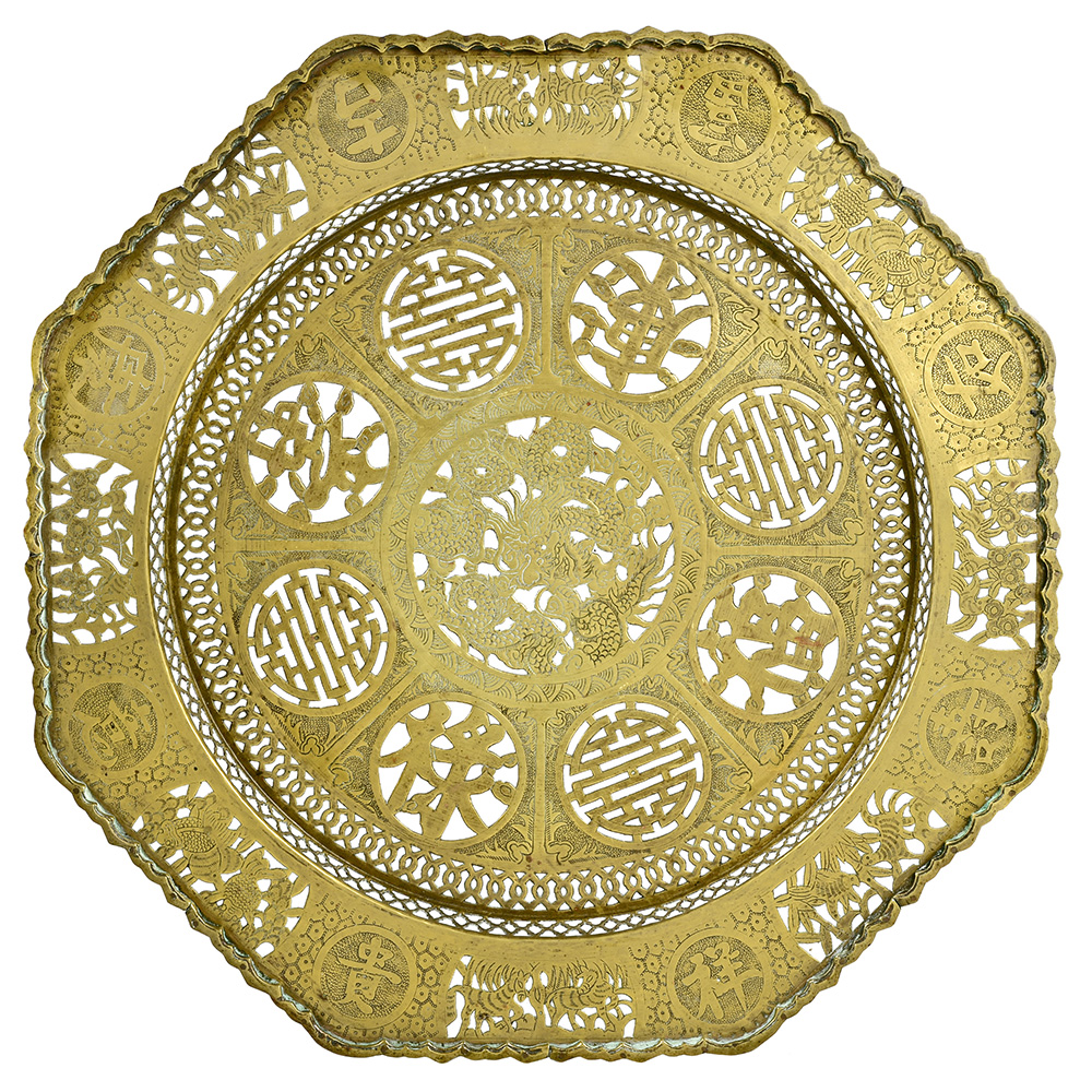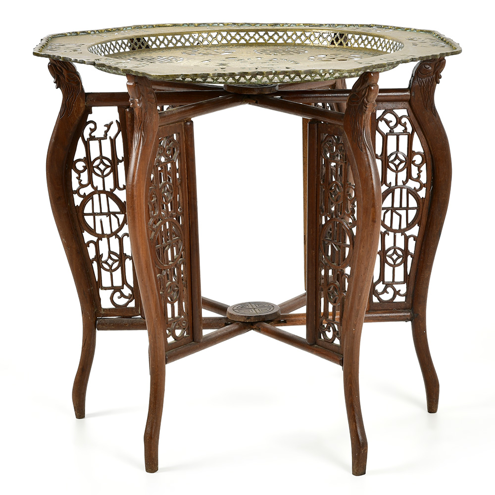 Table chinoise à plateau circulaire en cuivre ajouré et finement décoré de motifs traditionnels, reposant sur un piètement en bois sculpté. L’ensemble présente un travail décoratif riche et élégant, typique de l’esthétique chinoise, mêlant symboles et savoir-faire artisanal.