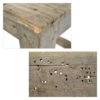 Fabriquée en bois ancien, cette table présente une finition brute volontairement laissée dans son jus. Le veinage du bois, les nœuds apparents et les perforations laissées par l’usage ou d’anciens clous en font une pièce vivante, au charme rustique et sans artifice.