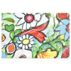- Composition : Un vase aux tons orangés accueille une profusion de fleurs stylisées, aux formes naïves et colorées : bleu électrique, rouge carmin, jaune tendre, rose framboise… Chaque élément est cerné de noir, accentuant le dynamisme de l’ensemble.