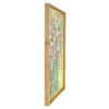- Composition : Un vase bleu turquoise débordant d’une profusion de fleurs stylisées aux teintes éclatantes : rouge coquelicot, rose dragée, bleu ciel, jaune citron… Le tout se détache sur un fond lumineux à dominante dorée, légèrement texturée.