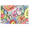 - Composition : Un vase gris à reflets irisés déborde d’un bouquet dense de fleurs stylisées aux couleurs lumineuses : jaune mimosa, rouge coquelicot, rose bonbon, bleu roi… Les feuillages, parfois grimpants, s’élancent librement vers les bords du cadre.