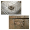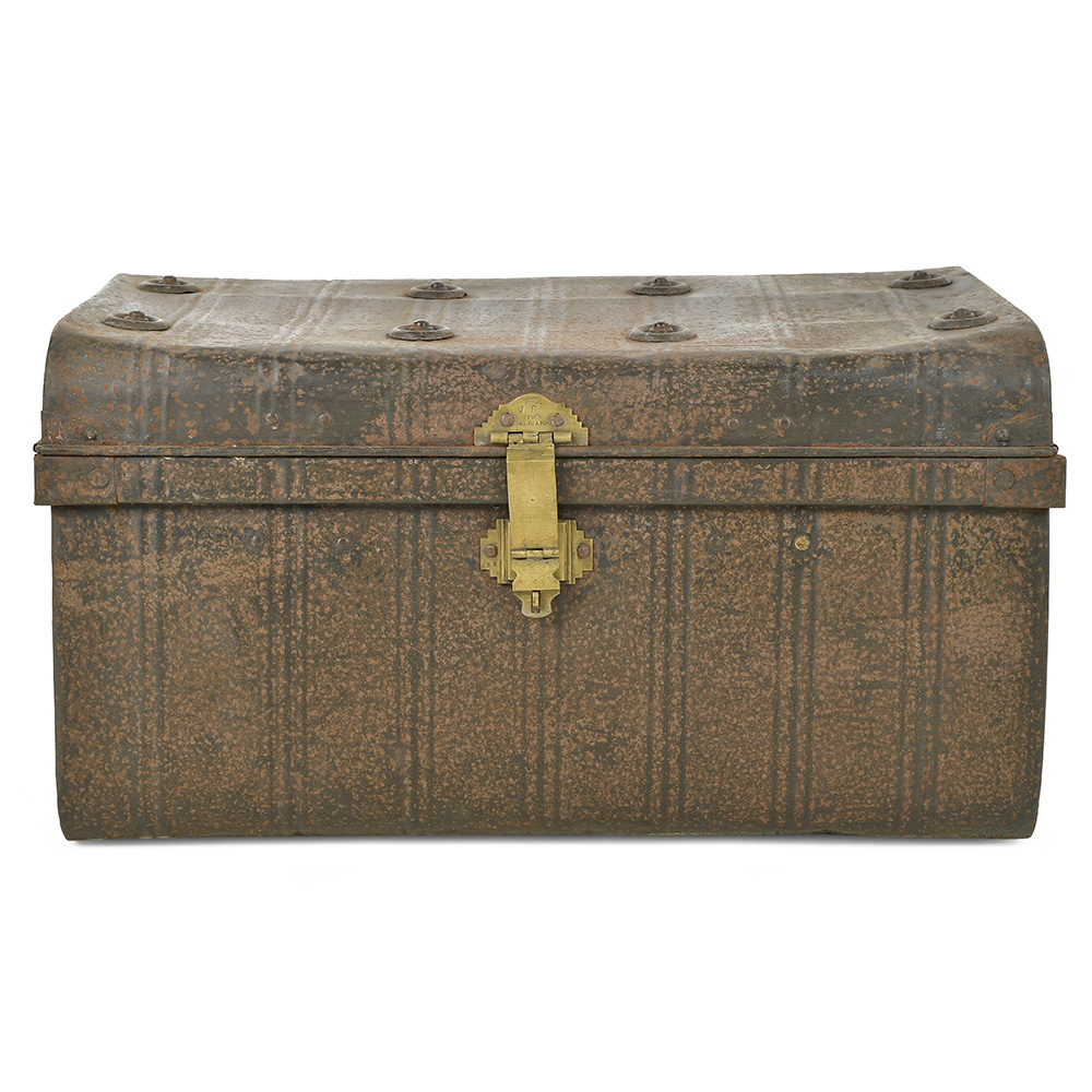 Entièrement réalisée en tôle d’acier emboutie, cette pièce se distingue par sa structure robuste, son couvercle bombé renforcé de rivets et sa serrure en laiton d’origine, encore en place. La patine, authentique et homogène, révèle une oxydation ancienne naturelle qui témoigne de son usage et de son âge, sans altérer la solidité de l’ensemble.