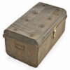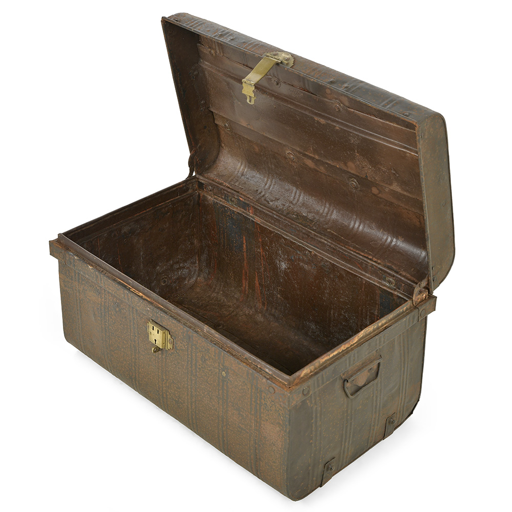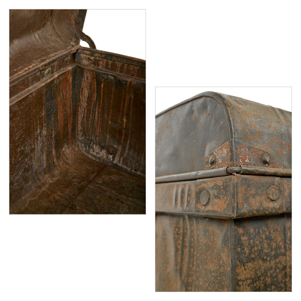L’intérieur, entièrement métallique, conserve une belle cohérence d’origine, avec des traces d’usage conformes à ce type d’objet utilitaire ancien. Les poignées latérales en métal, également d’origine, rappellent sa fonction première de coffre de transport, conçu pour résister aux manipulations répétées et aux conditions difficiles.