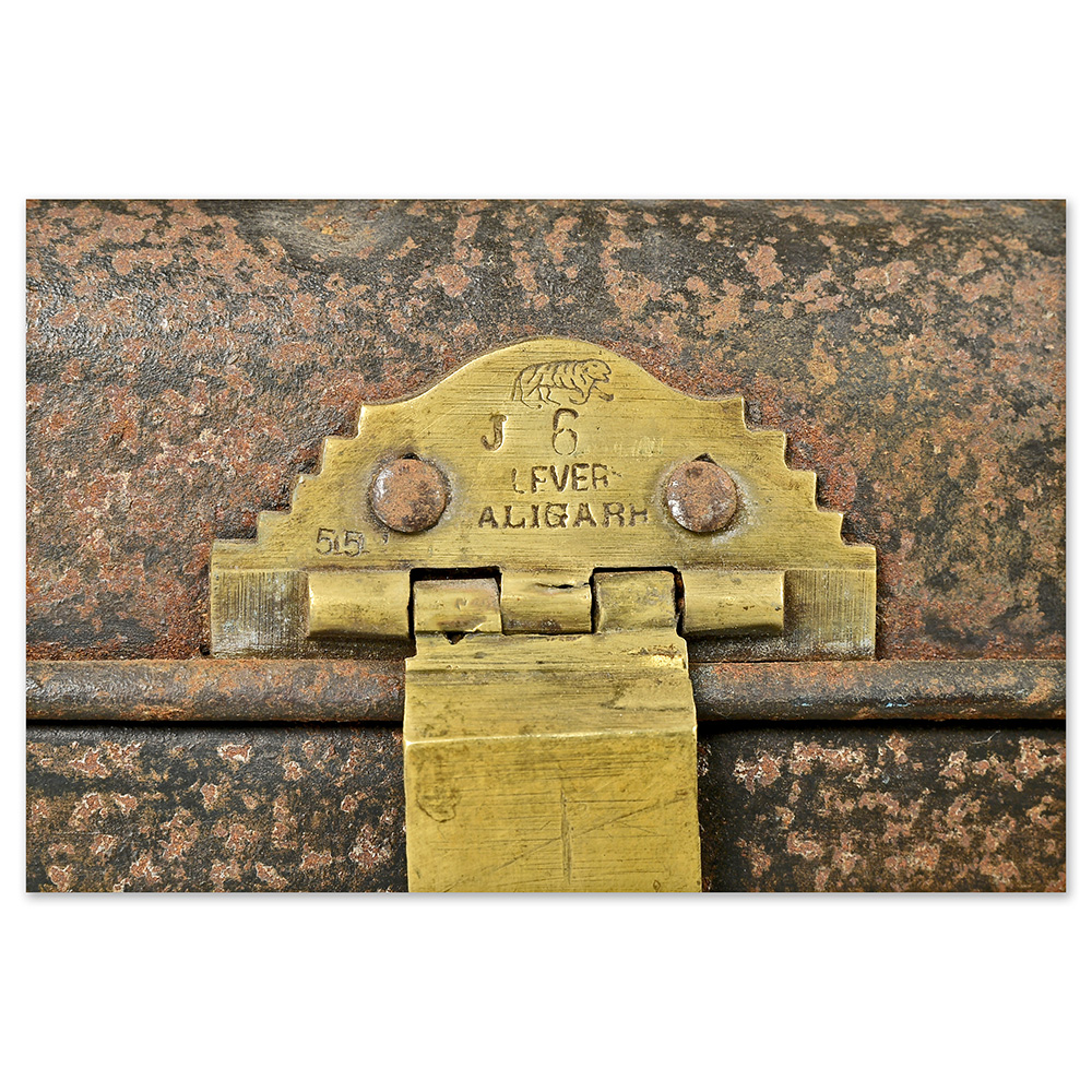 Typique des productions d’Aligarh du début du XXᵉ siècle, cette valise-coffre trouve aujourd’hui une nouvelle vie comme coffre de rangement, table basse, bout de canapé ou pièce forte de décoration dans un intérieur industriel, wabi-sabi ou de maison de campagne.